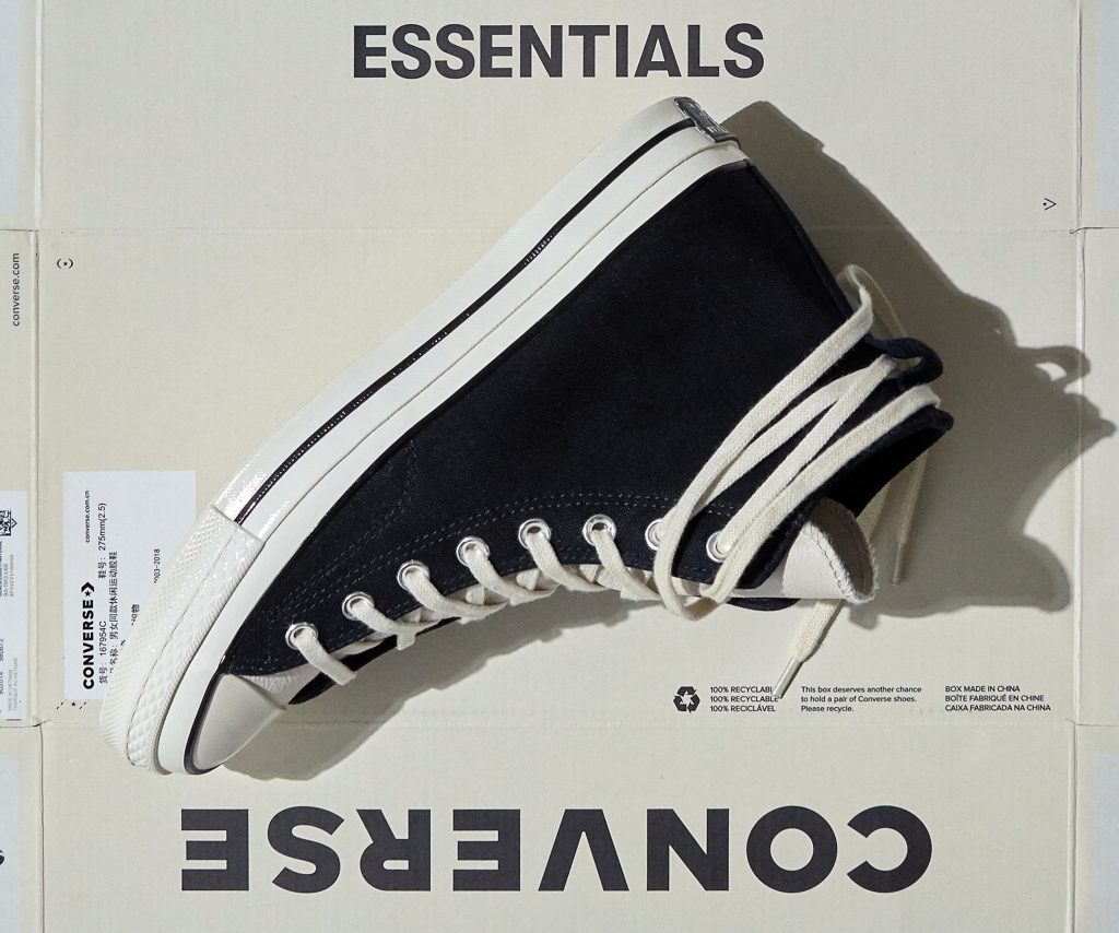 Converse x Fear of God ESSENTIALS聯名系列擁有黑米白與米白黑兩款中性配色,展現雙色調美學。高質感的帆布鞋面,加上皮革鞋舌,左右腳後跟不同的標誌裝飾,設計感在材質的碰撞中拼發而出。在鞋帶的設計上,Jerry也別出心裁,延長了鞋帶長度,達到可環繞鞋身的效果,並配有後跟拉環,將FOG ESSENTIALS上乘簡約的格調與Converse多變的風格完美融合。