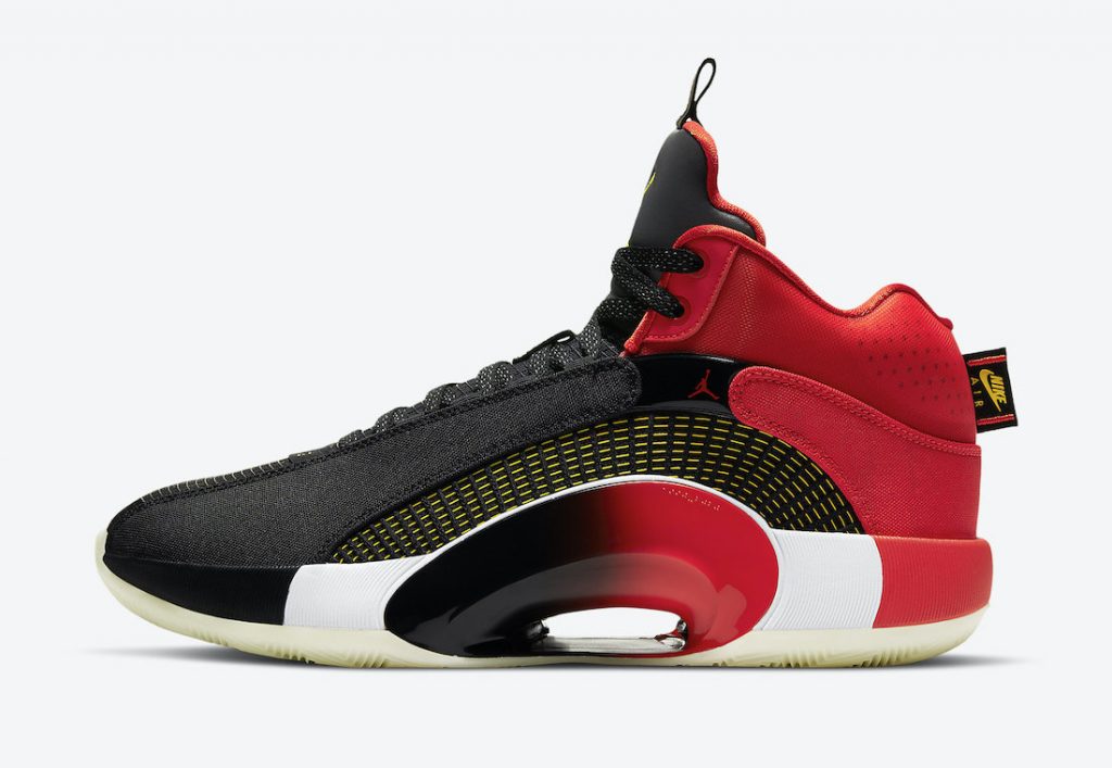 除了 AIR JORDAN 5 RETRO LOW CNY,AIR JORDAN XXXV 也推出 CNY 版本了,以傳統過年用的鞭炮為靈感,AIR JORDAN XXXV CNY 也可以「拆開」部份外皮而露出仿鞭炮包裝的圖䅁。