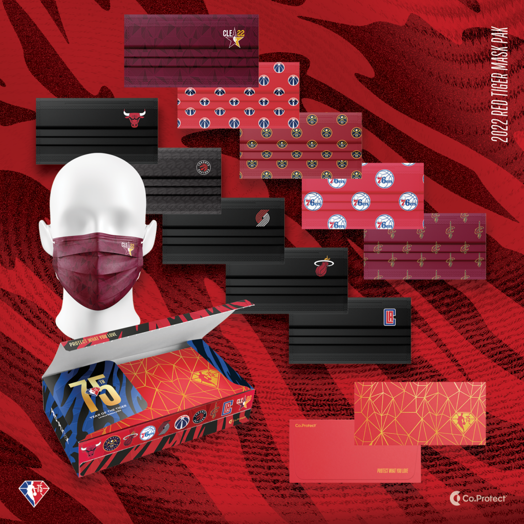 最後推介的,就有今回特別安排於期間限定活動重新復刻上架的 CO.PROTECT 2022 CNY 防疫禮盒套裝。為配合中國農曆新年與新一屆 NBA 2022 明星賽的舉 行,早於今年二月 CO.PROTECT 創作團隊就得到 NBA 官方授權,帶來備有 10 枚黑紅限量版口罩的防疫禮盒,當中除包括 9 款印有 76ERS、BULLS、CAVALIERS、 CLIPPERS HEAT、NUGGETS、TRAIL BLAZERS、RAPTORS 以及 WIZARDS 球隊標記的 特別版款式,更收納一款專門為 2022 ALL STAR GAME 特別設計的珍藏版口罩, 再加上印上虎紋圖騰的禮盒包裝設計,喜愛 NBA 的朋友當然絕對不能夠錯過。